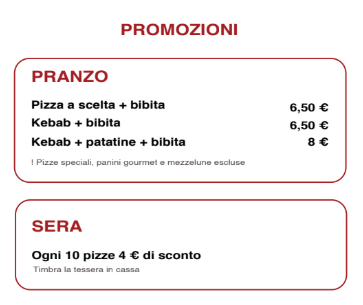Nota: ogni ingrediente aggiunto in più sulla pizza +1€ se su metà pizza, +2€ se sulla totalità della pizza. Se l’ingrediente aggiunto fa parte della seguente lista il prezzo varia nel seguente modo